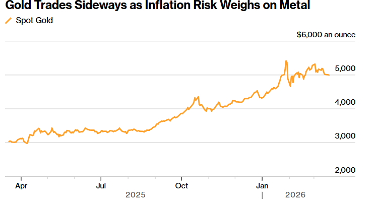 黄金在过去四个交易日中持续下跌,而今天的表现也不算乐观,价格继续在5,000美元这一关口附近窄幅整理。金价目前已连续第三周走低,尽管目前略有反弹。