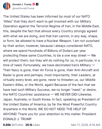 特朗普表示,美国多数北约盟友不愿参与对伊朗行动,但这并不会影响美国的战略选择。他在社交平台上写道:“幸运的是,我们已经摧毁了伊朗的军事力量——他们的海军、空军、防空系统和雷达系统都不复存在。”