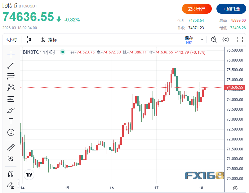 加密市场方面,比特币维持在74000美元上方,虽一度接近76000美元,但上涨动能明显减弱。