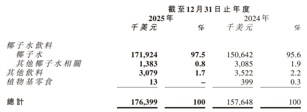 从产品结构来看,椰子水是公司的绝对支柱。财报数据披露,2025年椰子水收入同比增长14.1%,占总收入的97.5%;其他椰子水饮料收入同比下滑55.2%,占比仅0.8%;其他饮料收入占比1.7%,几乎可以忽略不计。这意味着,IFBH的业绩高度依赖椰子水单品,抗风险能力极弱,一旦椰子水业务出现问题,将直接影响公司整体营收与利润。