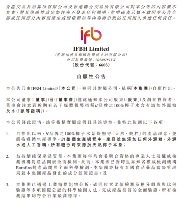 虽然新京报消费研究院将四款椰子水样品都打上了马赛克,但从包装形态及容量规格来看,这四款产品分别为泰国进口网红品牌IF椰子水、盒马自营椰子水、在直播电商渠道销量较高的轻上,以及主打“NFC非浓缩还原”概念的佳果源。而IF椰子水的母公司,正是2025年6月刚刚登陆港股的IFBH(06603.HK),这家被市场寄予厚望的“椰子水第一股”,上市不足一年便陷入品质信任危机。