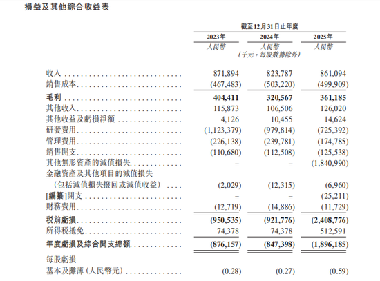 净亏损:2023、2024及2025年,年度亏损分别为人民币8.76亿元、8.47亿元和18.96亿元。
