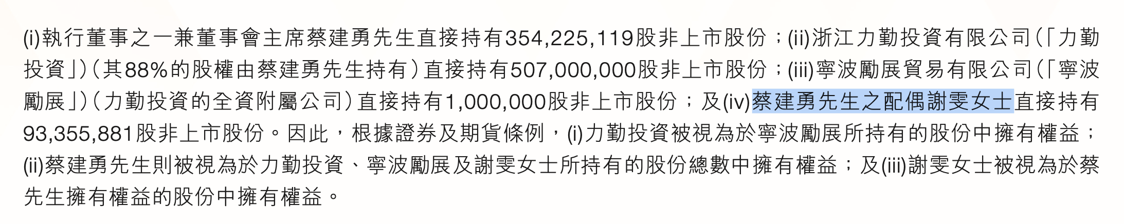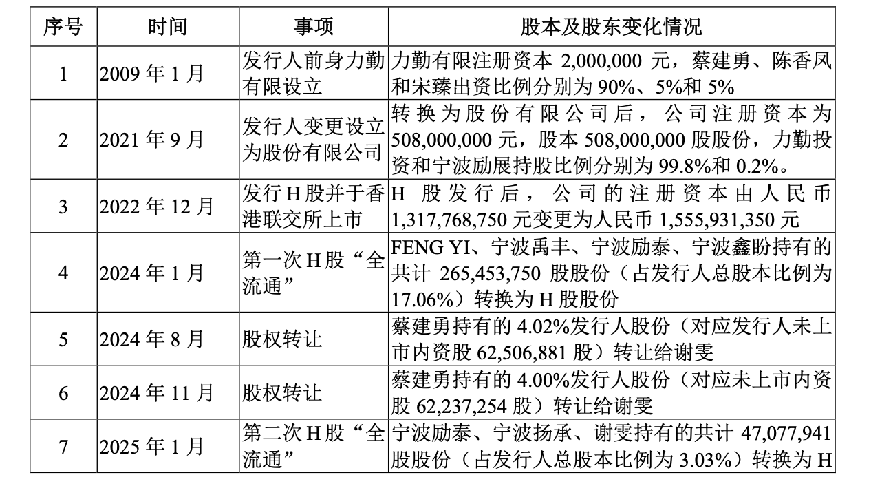 在2022年12月力勤资源赴港上市时,其实控人蔡建勇与谢雯还是夫妻,被共同认定为控股股东。2024年9月披露的公司中期报告里,谢雯的身份依然是“蔡建勇先生之配偶”,然而到2025年底申报A股IPO时,谢雯已变成“前妻”。