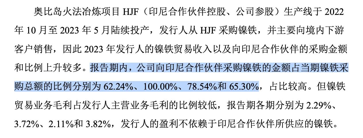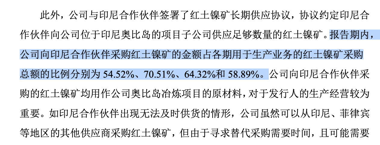 招股书显示,报告期内公司向印尼合作伙伴采购的红土镍矿占生产业务采购总额的比例分别为54.52%、70.51%、64.32%和 58.89%,一度超过了70%;向印尼合作伙伴采购镍铁占采购总额的比例分别为62.24%、100.00%、78.54%和65.30%,更重要的是,在原材料定价方面遵循印尼能矿部公布的HPM定价公式,主动权并不完全掌握在自己手中。