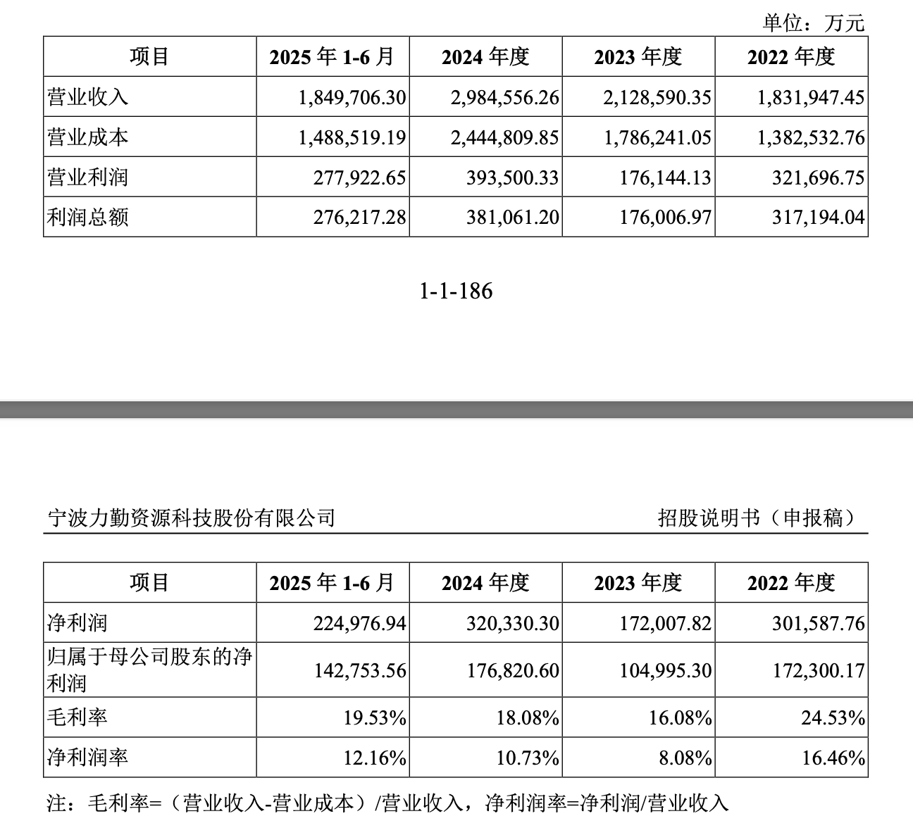 招股书显示,2022年至2025年上半年,力勤资源营业收入分别为183.19亿元、212.86亿元、298.46亿元和184.97亿元,呈现稳健增长态势,然而,与营收的节节攀升相比,其净利润表现却如同“过山车”。报告期内,公司归母净利润分别为17.23亿元、10.50亿元、17.68亿元和14.27亿元,2023年净利润下滑显著,2024年虽大幅反弹,但波动性显而易见。