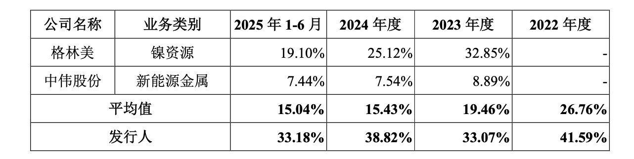 更值得关注的是,无论镍产品贸易还是生产业务,力勤资源的毛利率均显著高于同行均值。报告期内,其镍生产业务毛利率分别为41.59%、33.07%、38.82%和33.18%,同行可比公司的平均值分别只有26.76%、19.46%、15.43%和15.04%。对此,公司解释为“贸易品种差异”及“产品类型结构差异”。在行业周期下行、竞争加剧的背景下,这种高毛利能否持续,需打上问号。