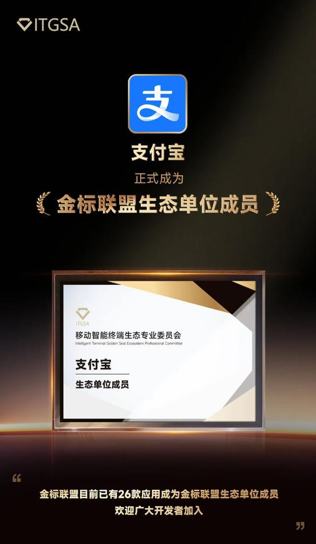 IT之家 3 月 20 日消息,移动智能终端生态联盟今日宣布,支付宝正式成为金标联盟生态单位成员,目前已有 26 款应用成为金标联盟生态单位成员。