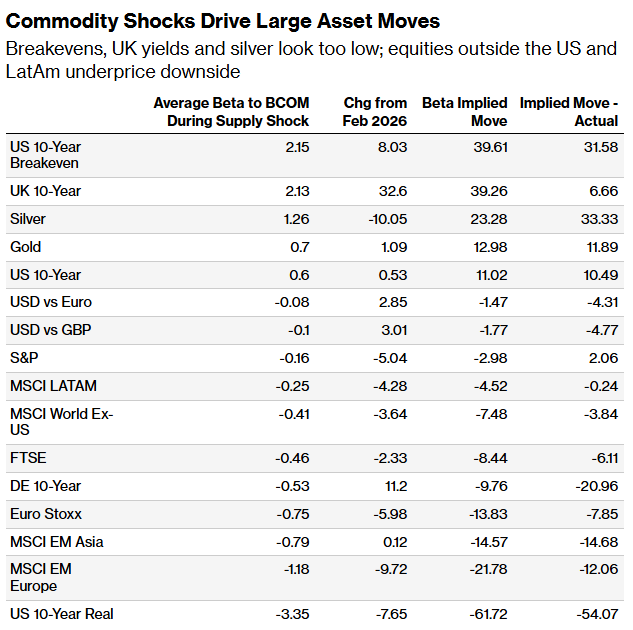 为了评估伊朗冲突可能引发的市场波动,一项最新研究分析了过去四次大宗商品供应冲击期间(1973年石油禁运、1979年伊朗革命、1990年科威特战争以及2022年俄乌战争)资产价格与大宗商品之间的关系。根据商品指数BCOM目前的走势,这些贝塔系数表明,市场调整幅度远大于当前定价。