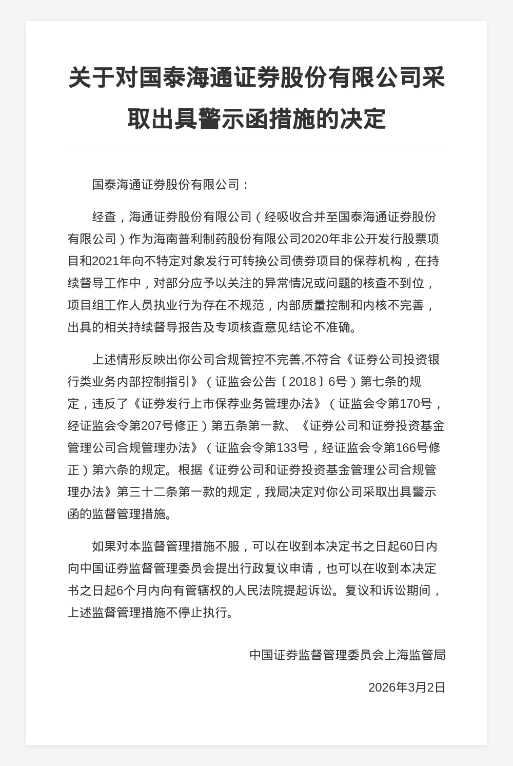 对此,中国证券监督管理委员会上海监管局决定对国泰海通证券股份有限公司采取出具警示函的监督管理措施。
