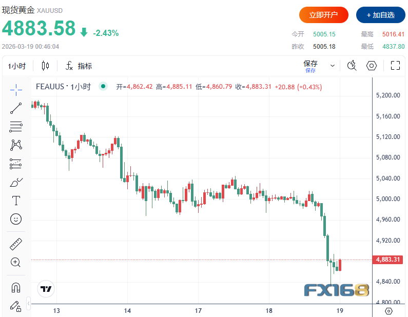周三(3月18日),现货黄金(XAU/USD)延续弱势,在美元与美债收益率反弹的压制下进一步下跌,盘中一度触及2月6日以来最低水平4834.14美元/盎司,随后在4880美元附近整理。市场焦点则转向稍晚公布的美联储利率决议。与此同时,美国2月生产者物价指数(PPI)意外强劲,加之中东战火持续升级推高能源价格,令市场对“高利率维持更久”的押注再度升温,黄金因此持续承压。