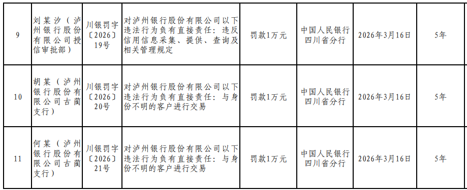刘某汐(泸州银行股份有限公司授信审批部)因对违反信用信息采集、提供、查询及相关管理规定的违法行为负有直接责任,被罚款1万元。