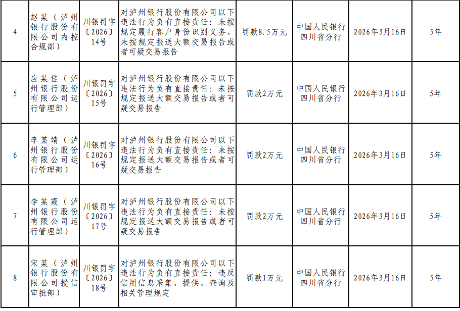 赵某(泸州银行股份有限公司内控合规部)因对未按规定履行客户身份识别义务、未按规定报送大额交易报告或者可疑交易报告的违法行为负有直接责任,被罚款8.5万元。