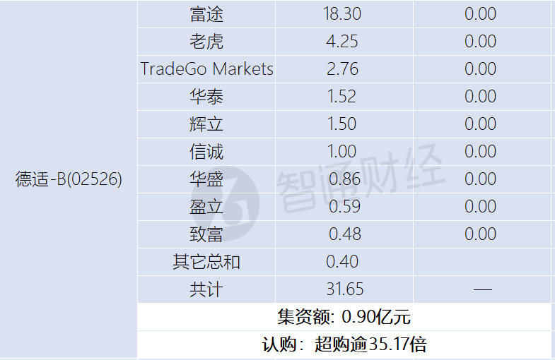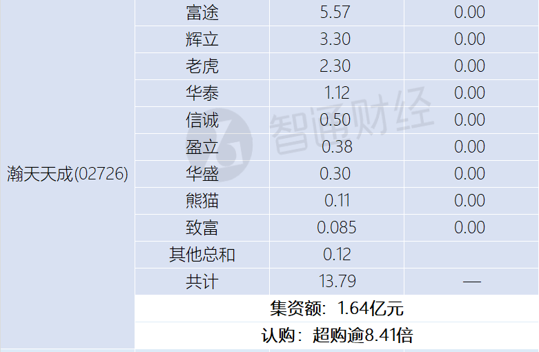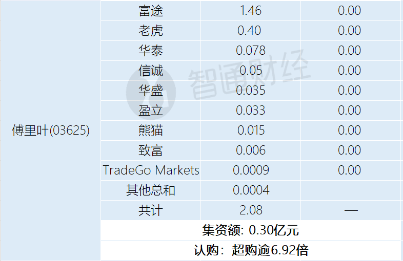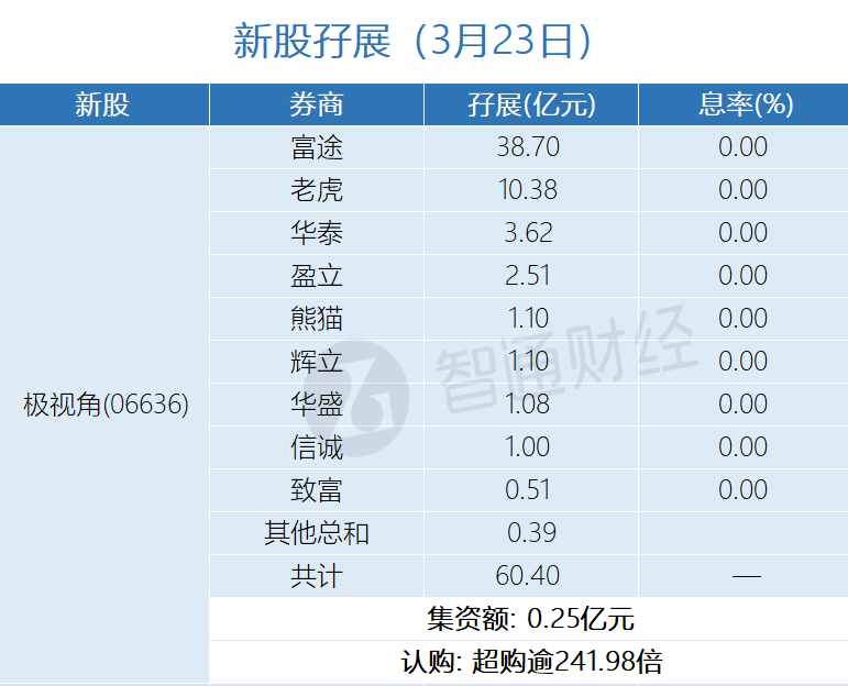 智通财经APP获悉,极视角(06636)、瀚天天成(02726)、铜师傅(00664)、华沿机器人(01021)、同仁堂医养(02667)、德适-B(02526)、傅里叶(03625)正在招股中。截至3月23日,富途证券、老虎证券等券商为极视角借出60.4亿港元,超购逾241.98倍;为瀚天天成借出13.79亿港元,超购逾8.41倍;为铜师傅借出1.54亿港元,超购逾3.06倍;为华沿机器人借出238.14亿港元,超购逾346.79倍;为同仁堂医养借出4.79亿港元,超购逾5.34倍;为德适-B借出31.65亿港元,超购逾35.17倍;为傅里叶借出2.08亿港元,超购逾6.92倍。