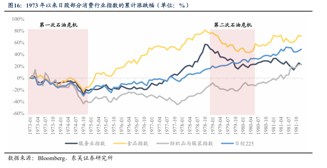 历史上海外滞胀时期,日美消费板块均偏承压。从日本市场来看,剔除拥有全球出口竞争力的家电等板块后,本土服务业、食品、纺织等纯内需消费细分,在滞胀阶段表现普遍疲软,1979-1980年中旬累计涨跌幅分别为-18%、-10%、-1%。美股方面,1970年-1981年,标普500中可选消费是权重回落幅度最大的板块,由20%降至10%,必选消费权重亦收缩至不到10%。细分维度上,地缘冲突推高农产品价格,成本传导下食品、食品零售板块盈利韧性凸显,1973-1980年中旬期间收益表现实现正增;而可选耐消、旅游出行等服务消费,需求端显著承压,同期均有双位数下跌。