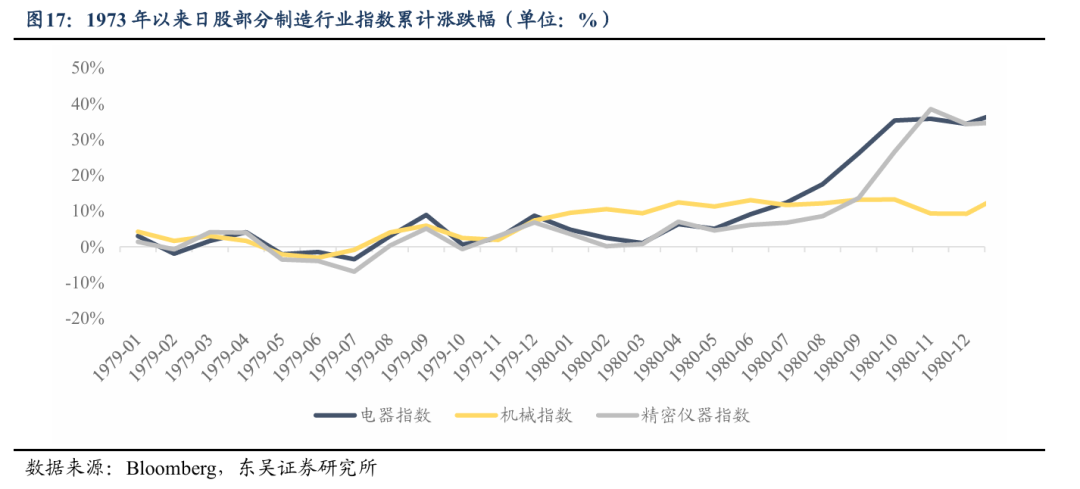 若市场围绕海外滞胀逻辑展开交易,上世纪70年代的日股走势,对A股整体表现,尤其是高端制造板块的演绎,均具备一定参考价值。彼时日本在技术创新与产业结构转型的路径上,与当下中国高度相似。首轮石油危机冲击下,日本依托重化工业的追赶型增长模式难以为继,被迫向节能、高附加值的技术密集型产业切换。70年代中期,日本同步推进能源结构优化,并大幅加码知识密集型产业投资,1975-1979年相关领域投资额年均增速达25%-30%。依托产业转型红利,日本制造业在第二轮滞胀周期中开启大规模出海扩张,全球竞争力显著提升,这一宏观与产业环境,与当前中国的发展处境相对契合。与日本“被危机倒逼”的被动转型不同,我国产业升级是立足经济新常态的主动战略布局,前瞻性与自主性更强。基于两国产业升级路径与核心特征的相似性,70 年代日本股市,尤其是第二轮滞胀阶段的运行脉络,以及日本高端制造的产业演进节奏,可为当前A股提供参照。