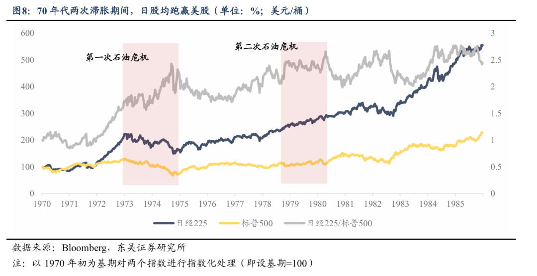 大滞胀期间,日股跑赢美股。第一次石油危机时,日股跌幅小于美股,主要由于美股正处于估值消化期。第二次石油危机中,日本依托市场化改革、技术创新与产业结构调整完成产业升级,对外部能源冲击的抵御能力更强、基本面韧性更足;而美国钢铁汽车等传统制造业受到日本等亚洲国家的激烈竞争,产业转型节奏偏慢,进一步加剧通胀粘性,工业产能利用率呈现波动下行态势。期间,日本CPI同比上升4.3pct、美国上升5.3pct,日本GDP同比回落3pct、美国则大幅下滑7.2pct。1977年至1980年中旬,日经225趋势性跑赢标普500,日经225累计涨幅达37%,同期标普500涨幅尚不足 10%。