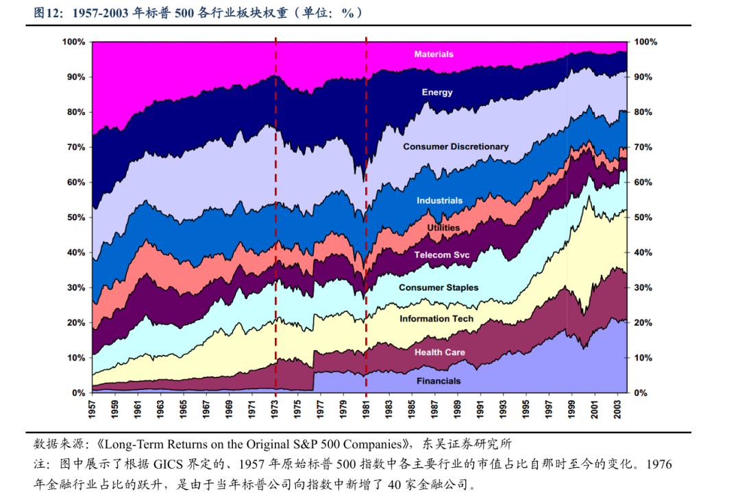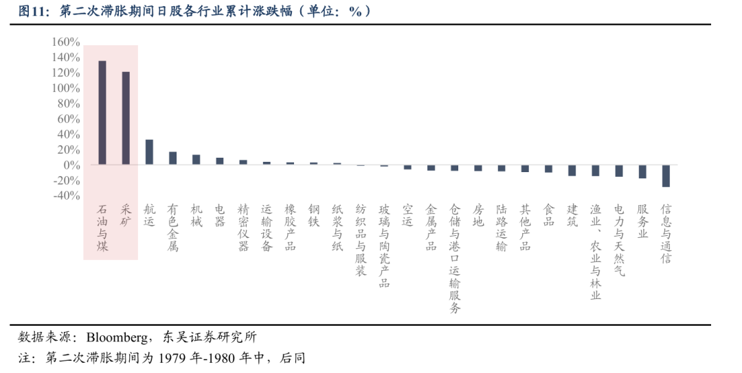 当年美日市场均呈现出相似的运行规律:两次石油危机期间,原油企业盈利大幅增厚,能源板块成为阶段内表现最优的赛道。标普500中,能源板块权重从1970年不足 20%,持续攀升至1981年接近30%的历史峰值;日股方面,石油与煤、采矿行业在第二轮滞胀周期中更是大幅领涨,累计涨幅分别达到 135%、121%。