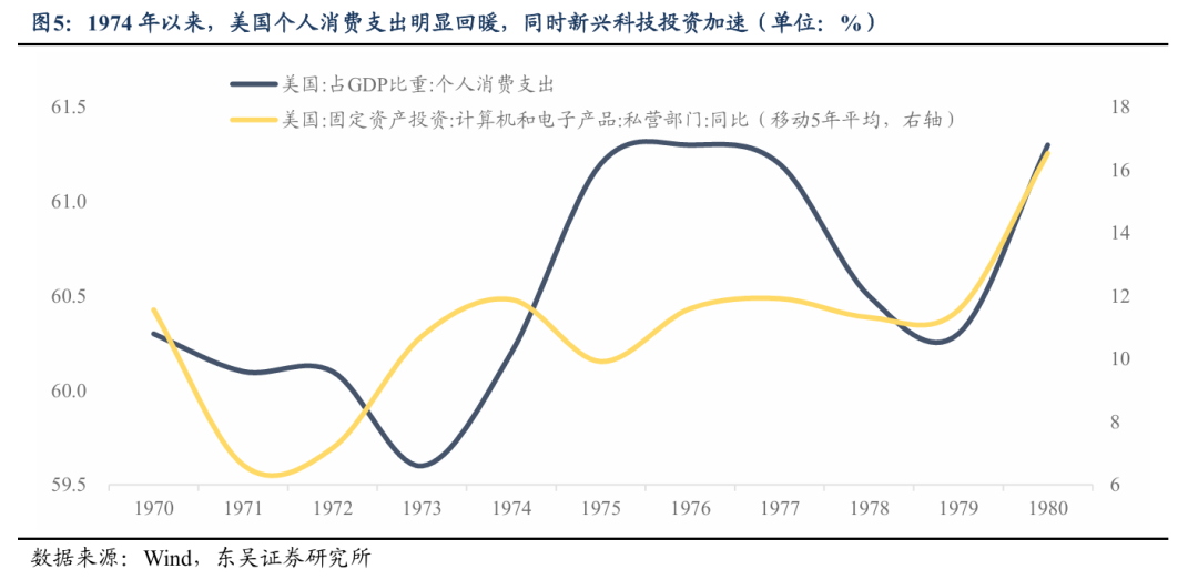 第二轮美股转涨,盈利是核心驱动。在经历了此前的“杀估值”后,标普500指数估值已经处于低位,进一步下行空间有限,对指数的拖累明显降低。而在盈利预期改善的驱动下,指数震荡走强。彼时沃尔克出任美联储主席后实施激进紧缩货币政策、快速压制高通胀,改善市场经济预期。同时美国经济结构性转型取得成效,对上市公司盈利有明显提振:一方面是私人消费占GDP比重持续回升,成为稳定经济的核心支柱;另一方面是对电子计算机等新兴领域的投资增速大幅改善,科技行业迎来快速发展。