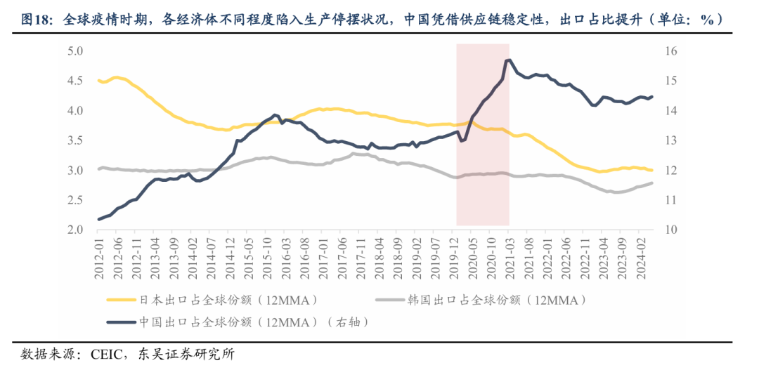 中国将凭借更完备的产业链优势,迎来全球产能向国内加速转移的窗口期,高端制造板块有望受益。日本在第二次滞胀期间,机械、精密仪器、电器、运输设备等高端制造板块虽涨幅不及能源板块,但整体仍实现正收益。本轮对于中国而言,过往经验已验证我国极强的出口替代能力:全球疫情期间,依托稳定完备的供应链体系,我国快速抢占海外供给缺口,出口在全球主要经济体中份额由2020年4月的13%快速抬升至2021年3月的16%,创下历史新高。当前地缘冲突加剧海外供给端不确定性,有望复刻此前逻辑,持续利好国内高端制造赛道。长期来看,相较当年转型期的日本,我国制造业具备更为领先的体系化优势:2024年制造业增加值占全球比重近30%,规模连续15年稳居全球首位;不仅拥有全球最完备的全产业链配套,在新能源核心赛道的布局也显著领先日韩等制造强国。在地缘扰动供应链重构的背景下,全球高端制造优质产能有望进一步加速向国内转移。
