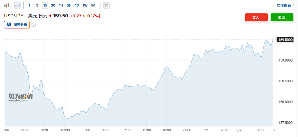 中东冲突加剧及油价上涨推高了美国长期国债收益率,并支撑美元走强。在三村淳发表上述讲话之后,日元兑美元汇率一度小幅升至1美元兑159.02日元,但随后转为回落。截至发稿,美元兑日元汇率涨0.17%,报159.50。