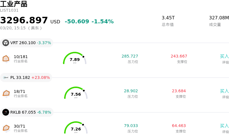 波音 (BA) 盘中下跌3.70%, 所属行业工业产品下跌1.54% ,公司涨幅跑输行业涨幅,行业成交额前三股票 Vertiv Holdings Co (VRT) 下跌 3.37%;Planet Labs PBC (PL) 上涨 23.08%;Rocket Lab USA Inc (RKLB) 下跌 6.78%。