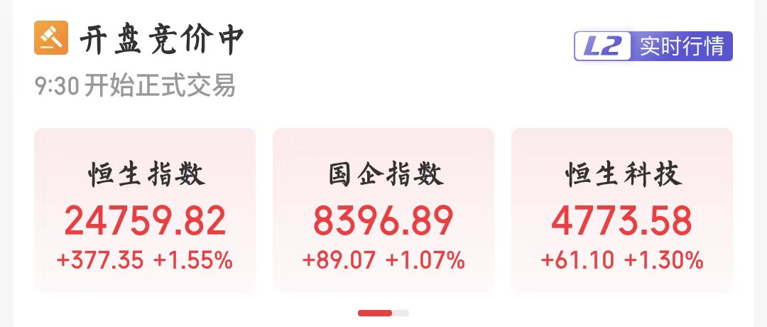 【大河财立方消息】3月24日,港股高开,恒生指数开盘涨1.55%,恒生科技指数涨1.3%。老铺黄金涨逾10%,药明康德涨逾3%,泡泡玛特、小鹏汽车、蔚来、快手、商汤涨逾2%。
