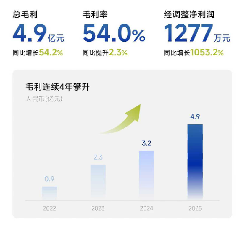 财报显示,2025年卧安机器人年营收9.0亿元,同比增长47.7%;毛利为4.9亿元,同比增长54.2%,毛利率进一步提高到54.0%;经调整后净利润增逾10倍,达到1277万元。