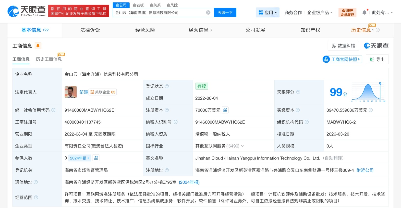 南方财经3月25日电,天眼查工商信息显示,近日,金山云(海南洋浦)信息科技有限公司发生工商变更,注册资本由6亿美元增至7亿美元,增幅约17%。该公司成立于2022年8月,法定代表人为邹涛,经营范围包括互联网域名注册服务、计算机软硬件及辅助设备批发、软件开发、软件销售等。股东信息显示,该公司由金山云有限公司全资持股。