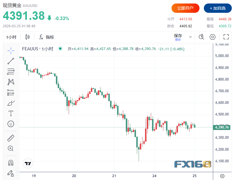 截至发稿时,现货黄金交投于约4391美元附近,自日内低点4305.72美元反弹。