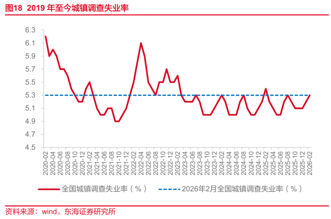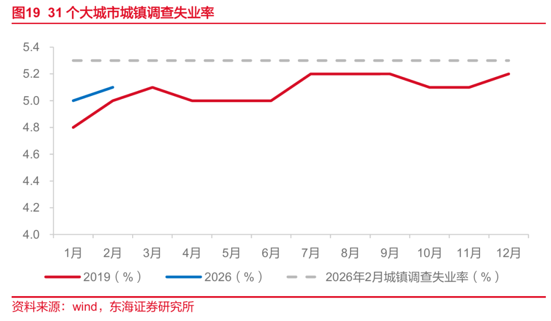 (2)大城市失业率环比提升。2026年2月,全国31个大城市城镇调查失业率5.1%,较上月环比提升0.1pct,低于城镇调查失业率0.2pct;对比2019年同期上升0.1pct。