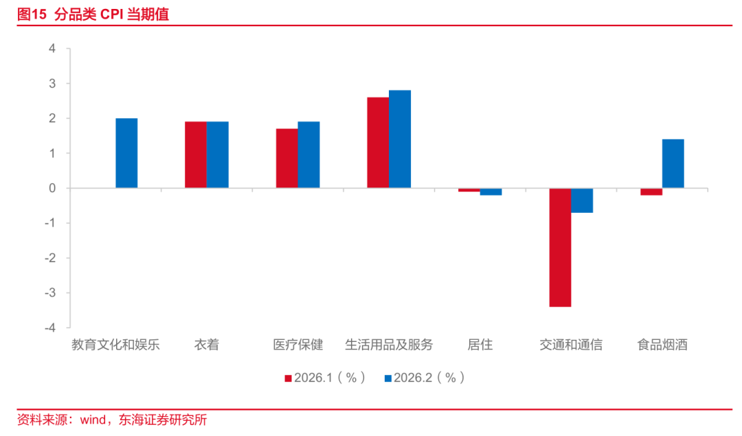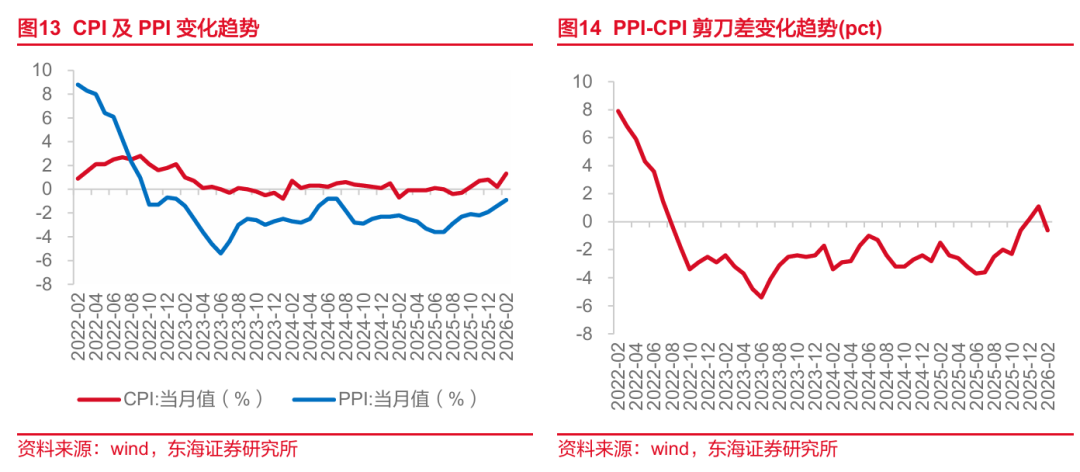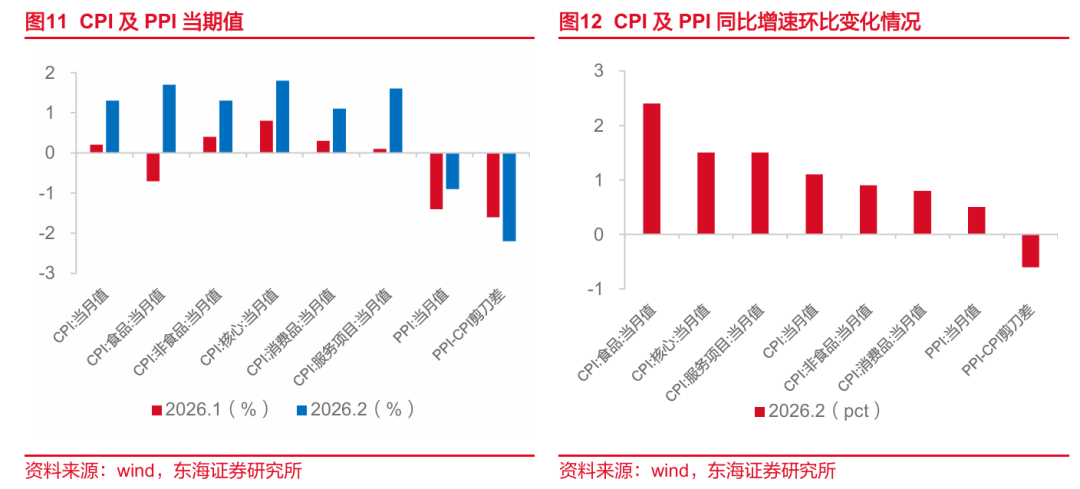 整体情况:CPI同比上升,PPI连续3个月降幅收窄,PPI-CPI剪刀差扩大。1>2月CPI同比上升。2026年2月CPI同比上升1.3%(环比+1.1pct),去掉食品、能源的核心CPI同比上涨1.8%(环比+1.0pct)。2>食品与非食品环比明显改善。食品价格由上月下降0.7%转为上涨1.7%,影响CPI同比上涨约0.30个百分点,非食品CPI同比上涨1.3%(环比+0.9)。3>消费品、服务同比均上升。消费品CPI同比+1.1%(环比+0.8pct),服务CPI同比+1.6%(环比+1.5pct)。4>PPI连续3个月降幅收窄,PPI-CPI剪刀差扩大。2月PPI同比-0.9%(环比+0.5pct),连续3个月降幅收窄,2月PPI-CPI剪刀差为-2.2%(环比-0.6pct)。