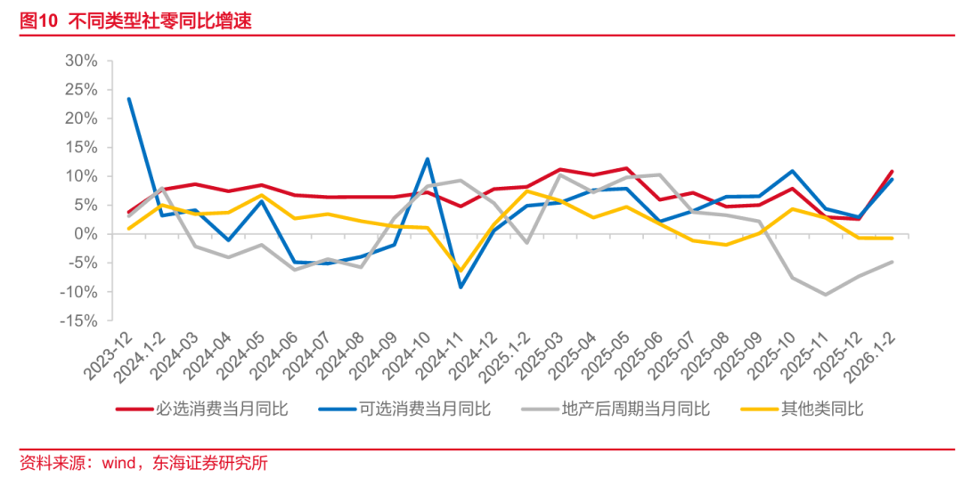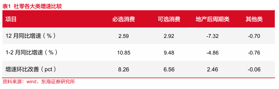 (2)大类表现:必选、可选增速弹性足,地产后周期类边际改善,其他类同比略降。1-2月必选、可选、地产后周期、其他类零售额同比分别为+10.85%、+9.48%、-4.86%、-0.76%,增速分别较上月环比+8.26pct、+6.56pct、+2.46pct、-0.06pct。
