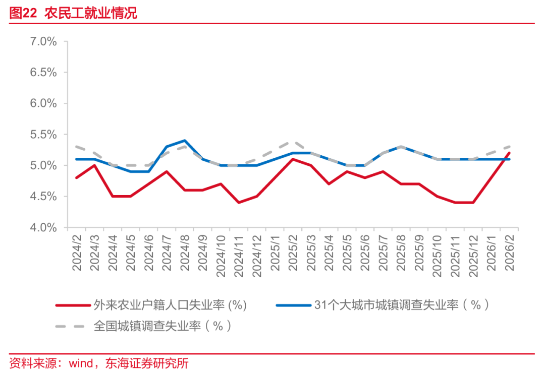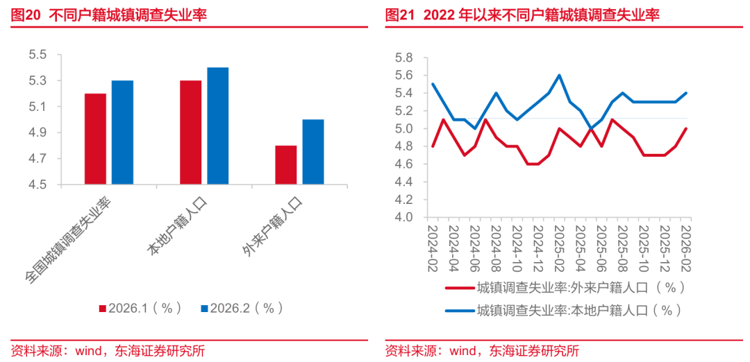 (3)按户籍结构:外来户籍劳动力失业率低于本地户籍。1>外来户籍与本地户籍失业率环比均提升。2026年2月外来户籍人口失业率为5%,与上月环比提升0.2pct,与去年同期持平。本地户籍失业率为5.4%,相比上月环比上升0.1pct,与去年同期相比下降0.2pct。2>农民工失业率环比提升。2026年2月外来农业户籍人口失业率5.2%,较上月环比提升0.8pct,预计受春节因素影响。