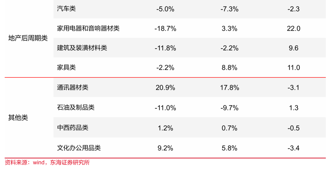 (3)具体品类分析:1>必选情况:烟酒类增速环比显著改善。各品类增速均为正,其中烟酒类同比增速最高,达19.1%,增速环比亦最显著,增速环比提升22.0pct。2>可选情况:金银珠宝和服装鞋帽、针、纺织品类同比增速较高。各品类同比均为正,其中金银珠宝和服装鞋帽、针、纺织品类增速达10%以上,分别同比上涨13.0%和10.4%。3>地产后周期:家具类同比表现好,家用电器和音响器材类环比改善显著。品类同比增速涨跌各半,其中家具类同比增速最高,达8.8%,家用电器和音响器材类增速环比改善幅度显著,达22.0pct。4>其他:通讯器材类维持高增速。除石油及制品同比为负,其余品类增速均为正,其中通讯器材类延续高增速,同比增速达17.8%。