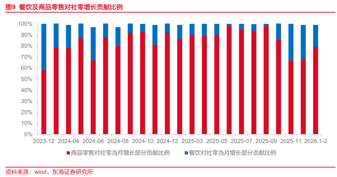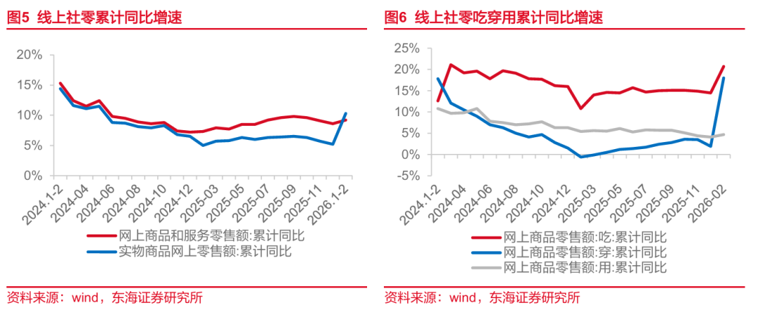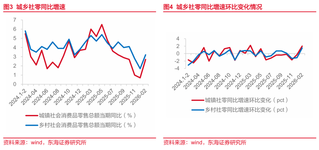 1-2月当月同比增长2.8%。2026年1-2月社会消费品零售总额86079亿元,同比增长2.8%,高于wind一致预期(+2.7%)。1)分地域:乡村增速快于城镇。1>城镇:1-2月消费品零售额74449亿元,同比增长2.7%,增速较上月环比提升2.0个百分点。2>乡村:1-2月乡村消费品零售额11630亿元,同比增速为3.2%,增速较上月环比提升1.5个百分点。受益于县乡地区商业体系持续完善,叠加春节期间“返乡游”和“县域游”升温,县乡市场销售潜力释放,包含镇区和乡村的县乡消费品零售额占社会消费品零售总额的比重为38.5%,比上年同期提高0.1个百分点。2)分渠道:线上、线下市场保持活力。1>1-2月线上维持较快增长。1-2月,网上商品和服务零售额和实物商品网上零售额累计分别同比增长9.2%和10.3%,增速较上月环比+5.1和+0.6pct。分品类来看,网上零售额吃、穿、用分别累计同比增长20.7%、18.0%、4.7%,较上月增速环比+6.2pct、+16.1pct、+0.6pct。2>服务消费市场保持活力。1-2月份,服务零售额同比增长5.6%,高于同期商品零售额3.1个百分点。并且受益于春节假期延长,居民出行意愿高涨,带动旅游、休闲等相关消费快速增长,1-2月份,旅游咨询租赁服务类、文体休闲服务类零售额实现两位数增长;春节假期,全国国内出游5.96亿人次,国内出游总花费超8000亿元,假日游客人数和花费均创历史新高。