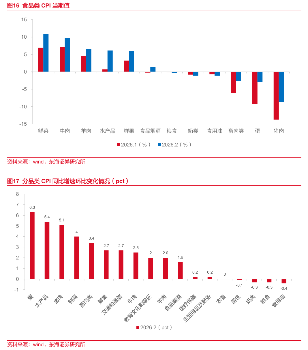 CPI同比上升,PPI连续3个月降幅收窄,PPI-CPI剪刀差扩大。1>2月CPI同比上升。2026年2月CPI同比上升1.3%(环比+1.1pct),去掉食品、能源的核心CPI同比上涨1.8%(环比+1.0pct)。2月PPI同比-0.9%(环比+0.5pct),连续3个月降幅收窄,2月PPI-CPI剪刀差为-2.2%(环比-0.6pct)。分品类:食品类价格涨幅扩大,非食品同比价格四涨二跌。1>食品类:2月食品烟酒及在外餐饮价格同比上涨1.4%,环比+1.6pct,其中鲜菜、牛肉、羊肉和鲜果价格涨幅在5.9%—10.9%之间,涨幅比上月均有所扩大,合计影响CPI同比上涨约0.41个百分点。2>非食品类:2月教育文化和娱乐、衣着、医疗保健、生活用品及服务、居住和交通通信分别同比+2.0%(环比+2.0pct)、+1.9%(环比持平)、+1.9%(环比+0.2pct)、+2.8%(环比+0.2pct)、-0.2%(环比-0.1pct)和-0.7%(环比+2.7pct)。