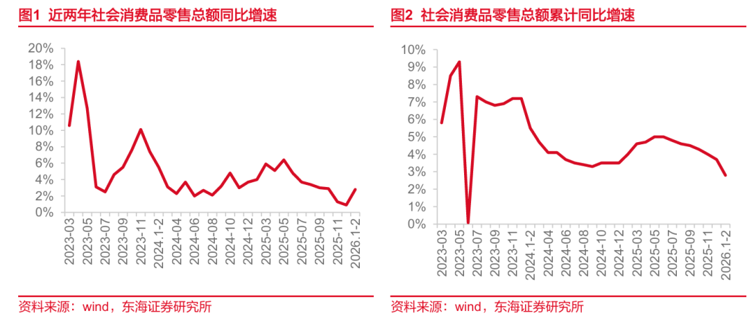(1)总体情况:1-2月当月同比增长2.8%。2026年1-2月社会消费品零售总额86079亿元,同比增长2.8%,高于wind一致预期(+2.7%)。