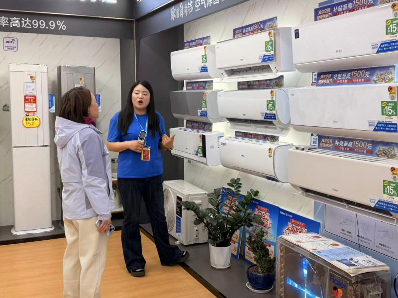 在苏宁易购朝阳路店,家住附近的消费者李女士想更换家中的空调,导购人员给她推荐了一款海尔A700空调,“这款空调价格5399元,享受国家15%补贴,再叠加苏宁、工厂补贴共计1914元,最终到手价3485元,我觉得挺划算,而且旧机还能上门拆掉,省心省力。”李女士说,店员告诉她可以通过微信、支付宝或百度客户端搜索“京通”小程序,进行真人认证后,进入“家电以旧换新专区”或“数码和智能产品购新补贴专区”领取对应补贴资格。