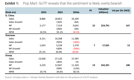 摩根士丹利SoTP的具体假设是:大中华区2026年销售增长26%、净利率34.5%(略低于2025年的35.1%),给予22倍市盈率;海外业务销售额下滑30%、净利润下滑约60%、净利率仅20%,给予7倍市盈率。集团整体对应销售增长仅1%、盈利下滑12%,折合每股港币180元。连这么算,也比现价高20%。