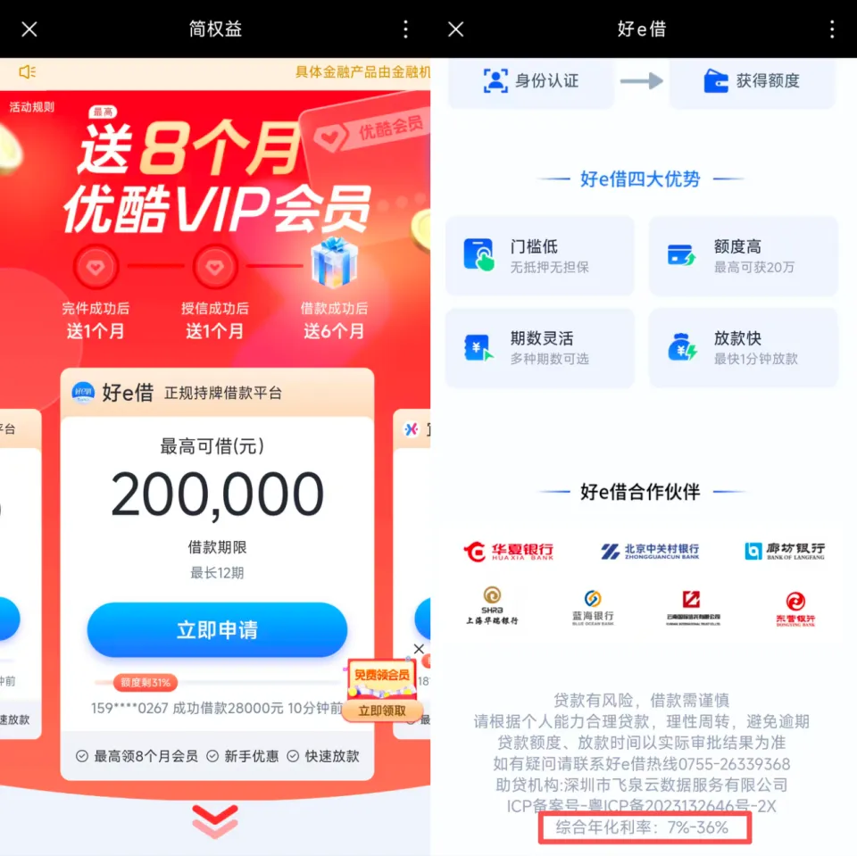 优酷视频APP-我的-借钱(简权益)正在做活动,最高送8个月优酷VIP会员(完件成功后送1个月,授信成功后送1个月,借款成功后送6个月)。优酷借钱合作引流的“好e借”页面显示,综合年化利率7%-36%,合作伙伴包括:华夏银行、中关村银行、廊坊银行、华瑞银行、蓝海银行、云南信托、东莞银行。