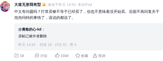 中文有问题吗?打算买够不等于已经买了,但也不意味着没开始买。后面不再回复关于泡泡玛特的事情了,该说的都说了。