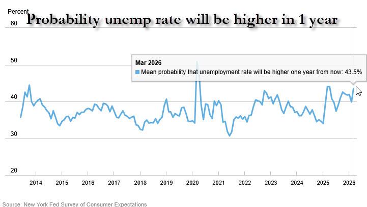 通胀预期上升的同时,受访者对劳动力市场的悲观情绪也在加剧。调查显示,受访者对未来一年美国失业率将上升的平均概率预期上升3.6个百分点至43.5%,为2025年4月以来最高水平。