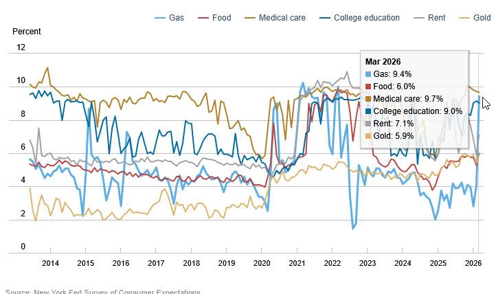本次调查中,汽油价格预期的跳升幅度尤为突出,成为拉动整体短期通胀预期上行的核心因素。受访者对未来一年汽油价格涨幅的预期从此前水平骤升5.3个百分点至9.4%,为2022年3月以来最高读数。