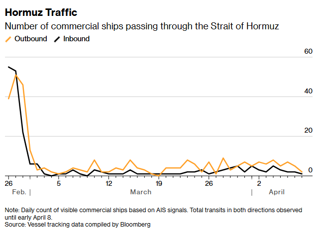 这项为期14天的停火协议据称以伊朗解除对霍尔木兹海峡封锁为条件,但尚未转化为航运活动的显著增加。4月8日及4月9日上午,仅有少数船只被观察到驶离波斯湾。正常情况下,每天约有135艘船只通过该海峡。