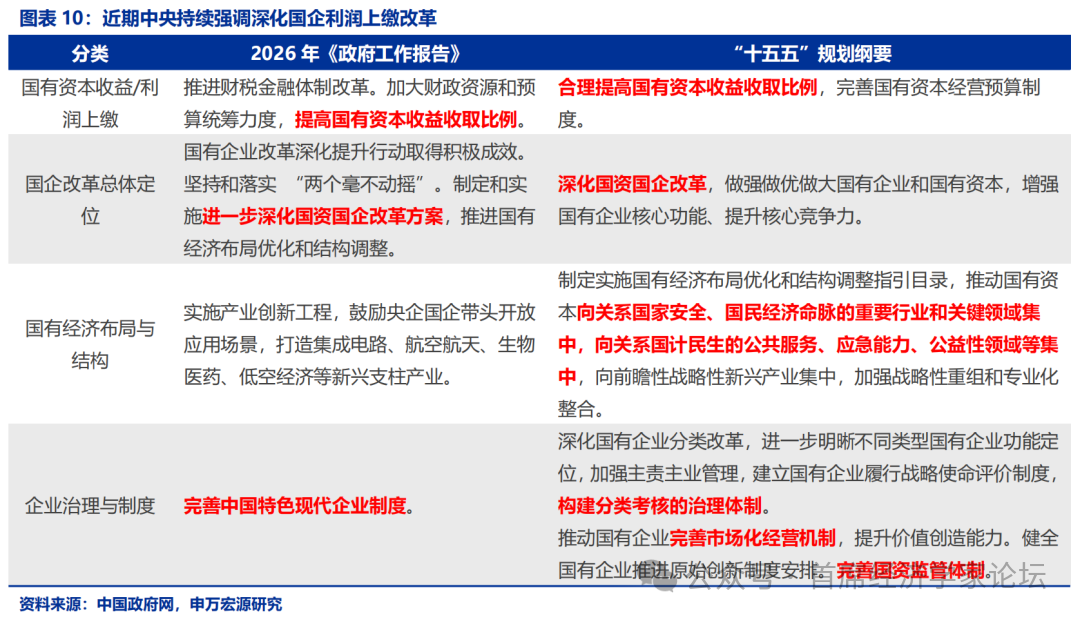 在此背景下,年初以来中央及财政部持续提及加快国企利润上缴制度改革。2026年《政府工作报告》明确提出“加大财政资源和预算统筹力度,提高国有资本收益收取比例”。“十五五”规划明确提出“合理提高国有资本收益收取比例”,并将其纳入国资国企改革与财税体制改革的双重框架。