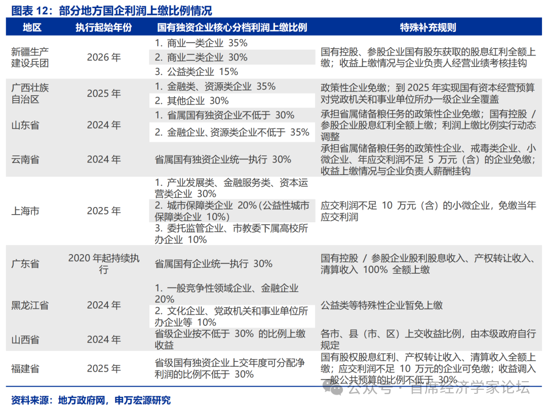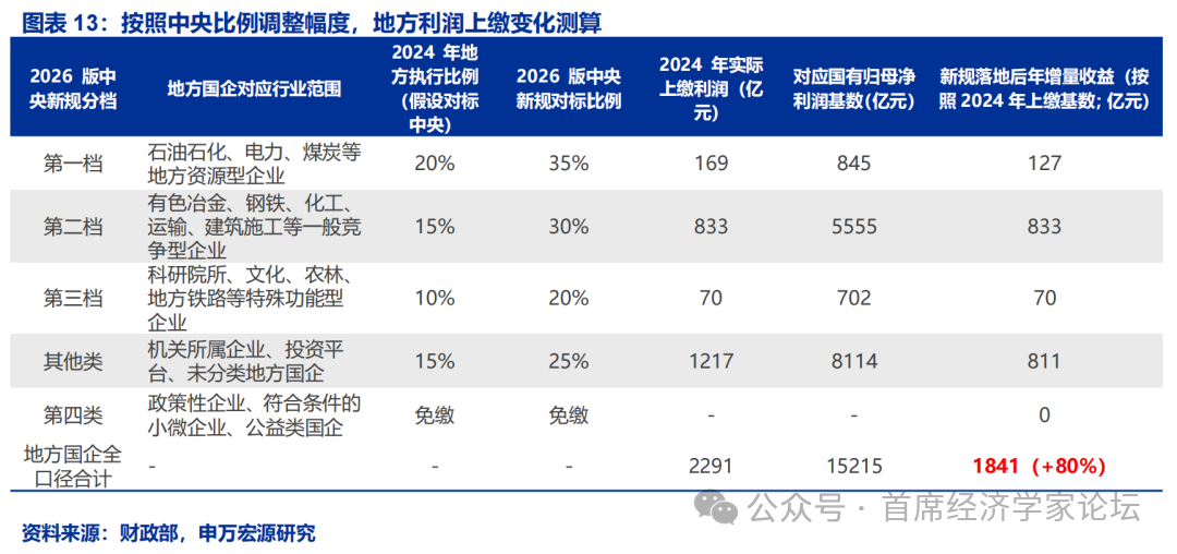地方后续或也参考央企利润上缴比例要求,进一步提升地方国企利润上缴比例。相比央企利润上缴有清晰的比例要求,地方国企上缴比例则由各级政府自定,普遍实行差异化分类管理,具体比例因地区而异。后续地方国企利润上缴或跟进改革。乐观情景,假设后续地方国有企业按照央企标准调整幅度上调利润上缴比例,以2024年上缴基数为例,则地方利润上缴收益同比或增长80%左右,多缴1800亿元左右。
