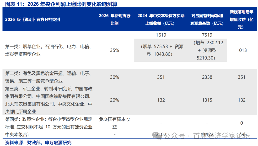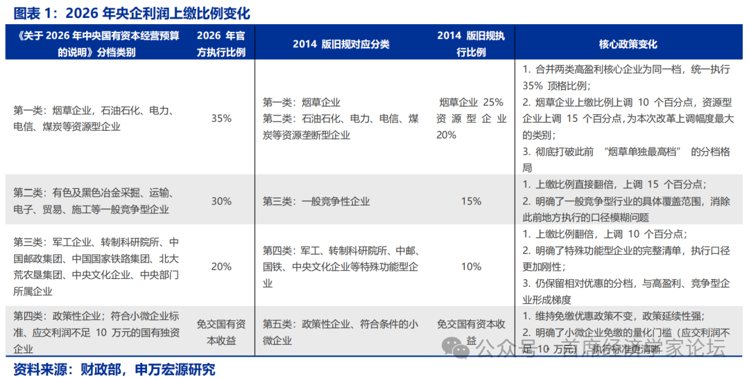3月下旬,财政部发布《关于2026年中央国有资本经营预算的说明》,全面上调央企利润上缴比例。2026年执行的最新标准为:烟草、石油石化、电力、电信、煤炭等资源型央企执行35%比例;一般竞争性央企(建筑、电子、化工、贸易等)执行30%;部分竞争性央企执行25%;军工、转制科研院所、中国邮政等战略保障类企业执行20%;中国储备粮、中国储备棉等政策性企业免交。相较2014年版央企利润上缴比例,烟草企业上缴比例上调10个百分点,资源型企业上调15个百分点;有色及黑色冶金采掘、运输、电子、贸易、施工等一般竞争型企业及特殊功能型企业上缴比例翻倍,分别上调15个百分点、10个百分点。