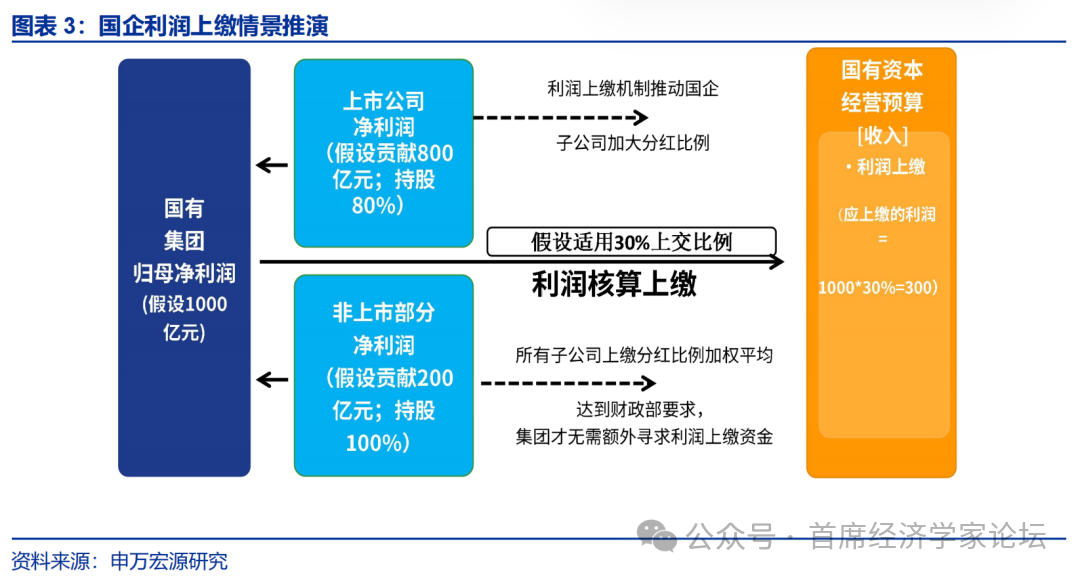 我国央企利润上缴实行国有资本经营预算制度,财政部按行业属性核定各央企集团的利润上缴比例。需要明确的是,虽然财政约束的直接对象是央企集团,要求其按合并报表归属于母公司所有者的净利润的核定比例申报并上缴利润,但集团层面通常仅承担战略管控职能,其申报的上缴资金主要来源于旗下各级子公司、上市平台及参股公司等经营主体按比例上缴的分红或利润返拨。