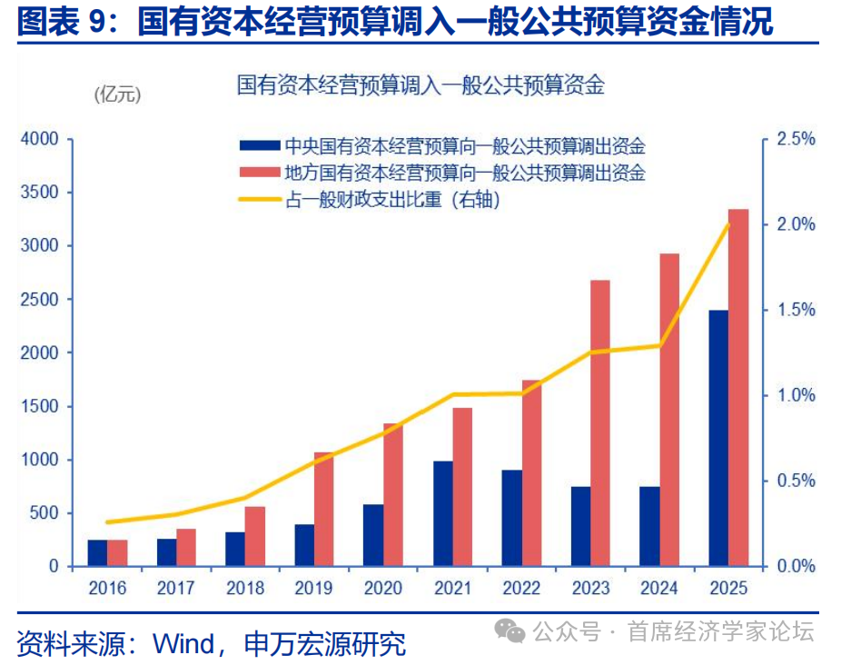 同时,优化国有资本经营预算支出结构,提高调入一般公共预算的比例,建立动态调整机制等或亦是改革推进领域。2025年全国国有资本经营预算支出已展现这一导向,全年支出约2647亿元,而调入一般公共预算高达5741亿元,调入资金占收入比例接近67%,创历史新高。从制度设计看,提高调入比例需与支出结构优化协同推进。传统支出大量用于”解决历史遗留问题、资本金注入、政策性补贴”等,或需逐步压缩。同时,或需进一步明确国有资本调入资金优先用于教育、医疗、养老、低保等领域,以及应对人口老龄化的社会保障需求。