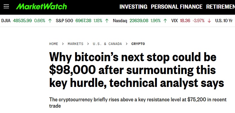 Stockton在接受MarketWatch采访时表示,如果比特币能够“在75,200美元上方维持几天——不同于1月中旬类似的突破尝试——那将标志着一次短期突破”。在这种情况下,比特币的近期前景将有所改善,下一个需要关注的目标位是 98,200美元。